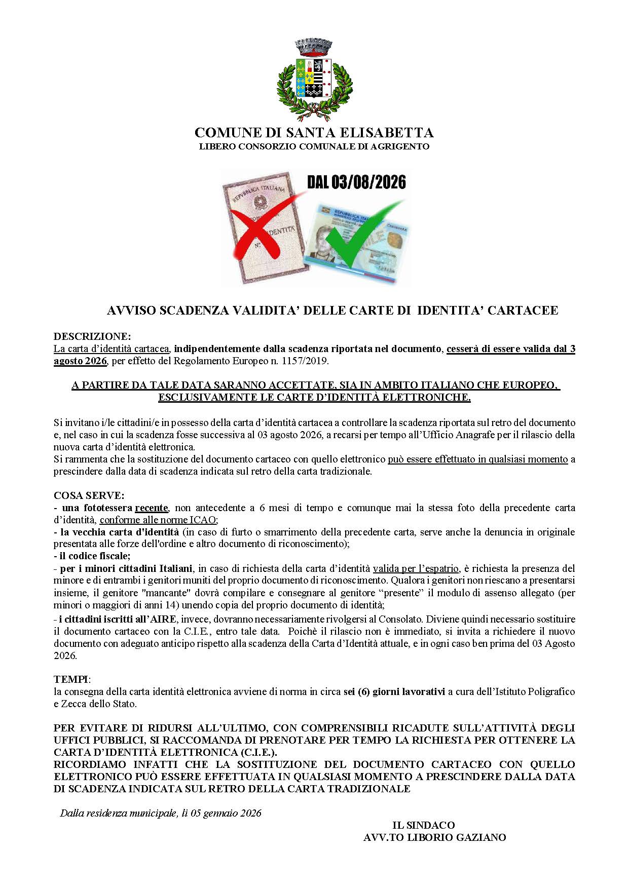 La carta d’identità cartacea, indipendentemente dalla scadenza riportata nel documento, cesserà di essere valida dal 3 agosto 2026, per effetto del Regolamento Europeo n. 1157/2019.