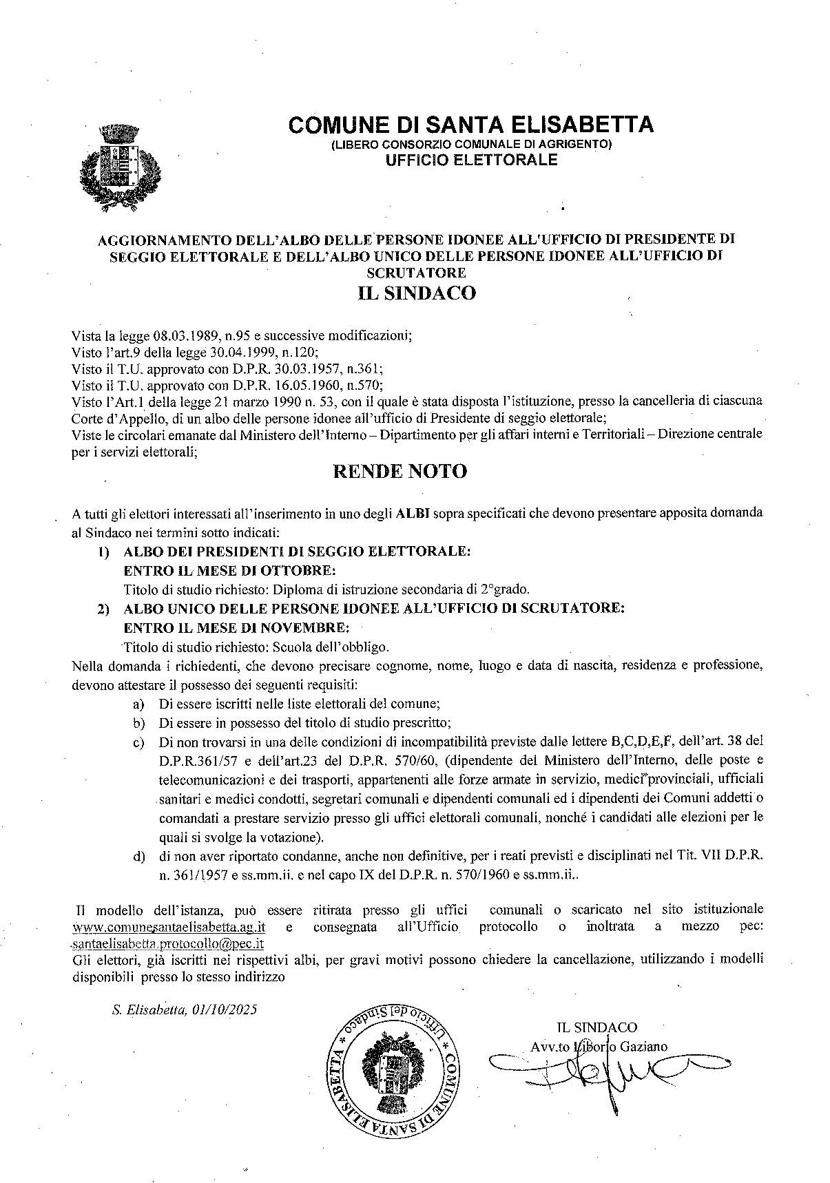 AGGIORNAMENTO DELL’ALBO DELLE PERSONE IDONEE ALL'UFFICIO DI PRESIDENTE DI SEGGIO ELETTORALE E DELL’ALBO UNICO DELLE PERSONE IDONEE ALL’UFFICIO DI SCRUTATORE